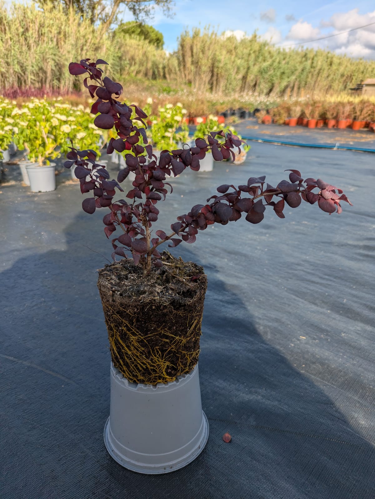 Arbusto vigoroso, caducifólio, apresenta um porte arredondado, atinge entre 1,5 a 2 metros de altura e largura, com ramificação densa e espinhosa.