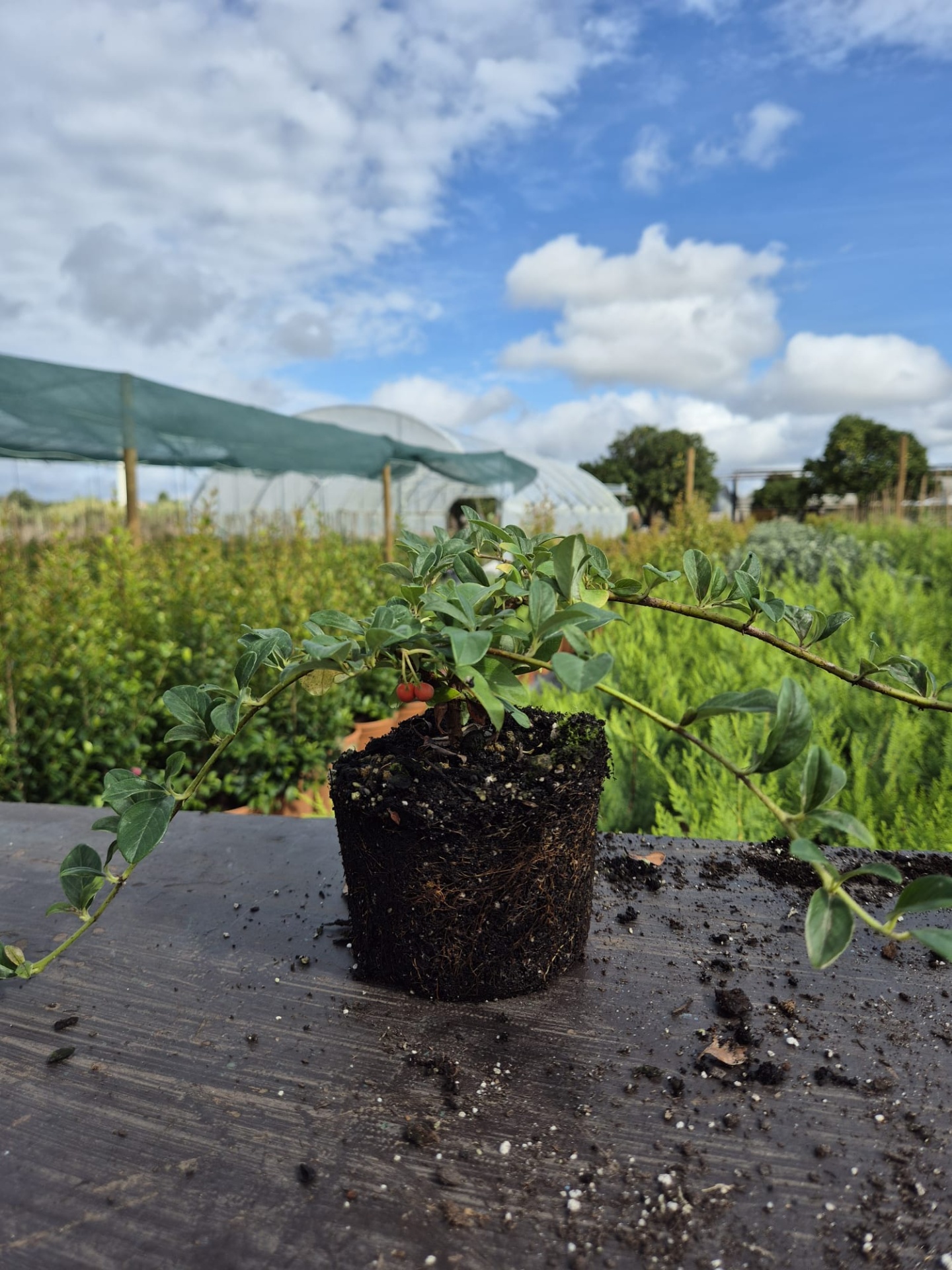 A folhagem é perene, de textura fina e cor verde-escura brilhante, mantendo-se ativa durante todo o ano. As flores, pequenas e brancas, surgem no final da primavera, agrupadas em inflorescências discretas que atraem polinizadores. Os frutos, bagas arredondadas de cor vermelha intensa, amadurecem no verão e persistem até ao inverno, oferecendo alimento a aves e contribuindo para a biodiversidade local.