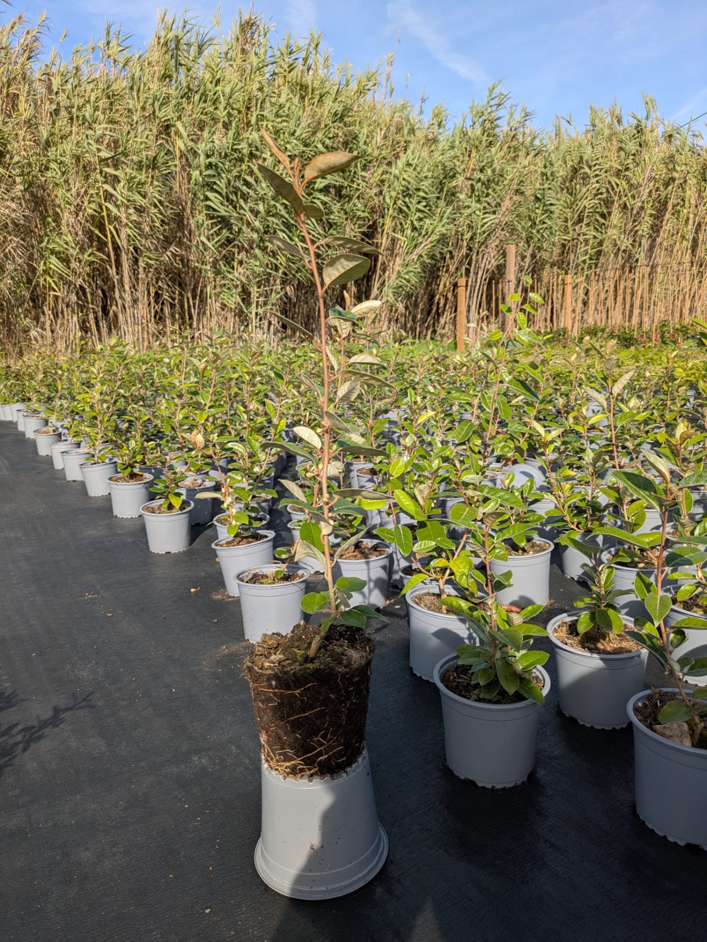 Destaca-se pela sua folhagem densa e coriácea, de tonalidade verde-escura na página superior e prateada na inferior, conferindo-lhe um aspeto ornamental marcante ao longo de todo o ano. Apresenta um crescimento moderado, podendo atingir entre 3 a 5 metros de altura e largura, formando sebes compactas e eficazes como barreiras visuais, corta-ventos ou elementos estruturantes em jardins e espaços públicos.