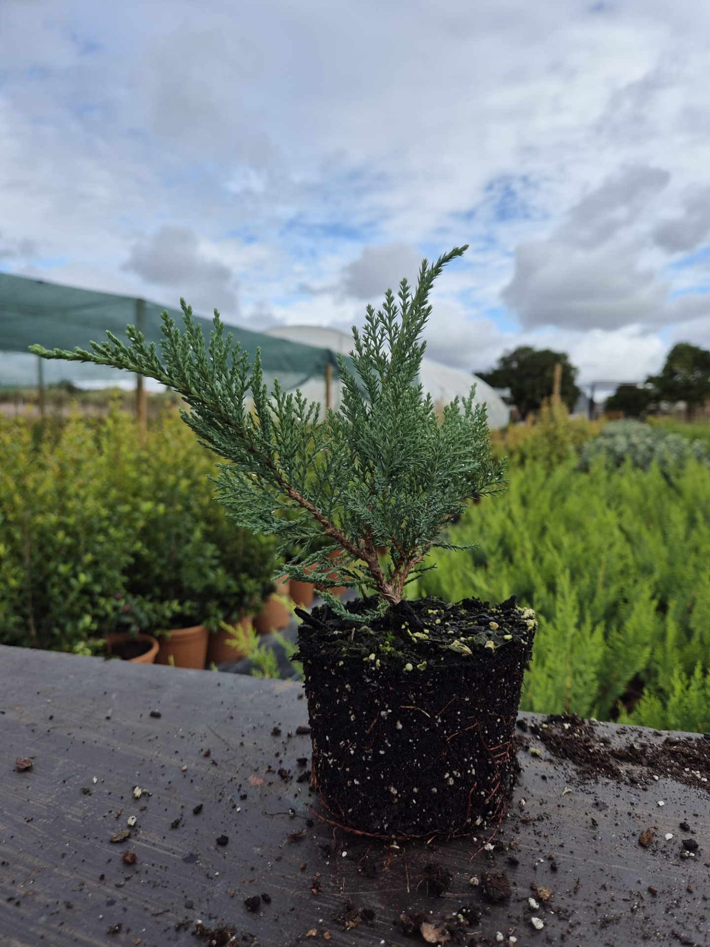 A folhagem é persistente, composta por agulhas finas e escamosas de cor verde-acinzentada, com aroma resinoso característico. A sua textura e coloração conferem-lhe grande valor ornamental, especialmente em composições com pedras, gramíneas ou espécies mediterrânicas.